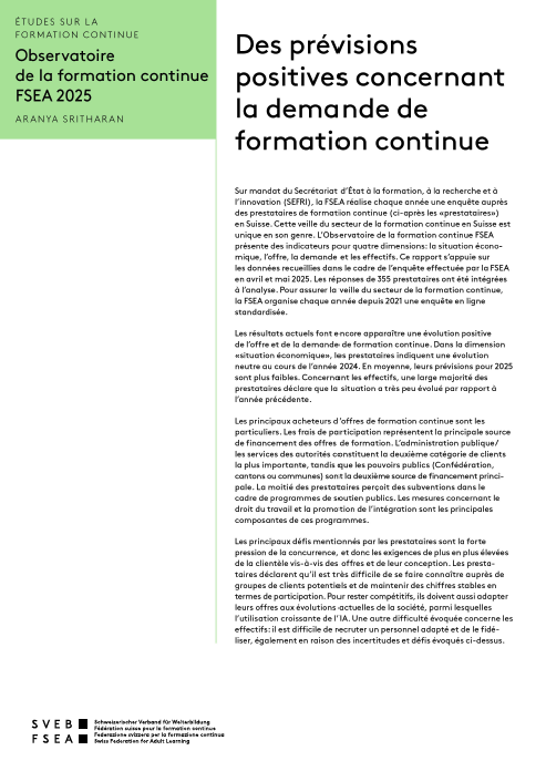 L’Observatoire de la formation continue FSEA 2023 continue de montrer des attentes positives malgré une situation économique incertaine et une concurrence accrue. En outre, la pénurie de personnel qualifié et le recrutement de participants constituent actuellement des défis majeurs pour les prestataires de formation continue.